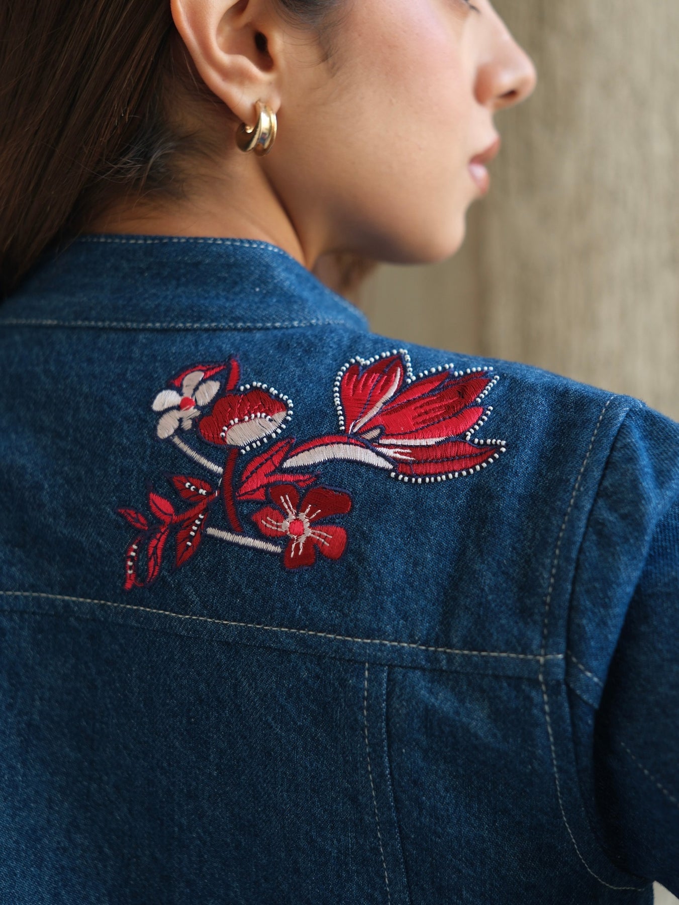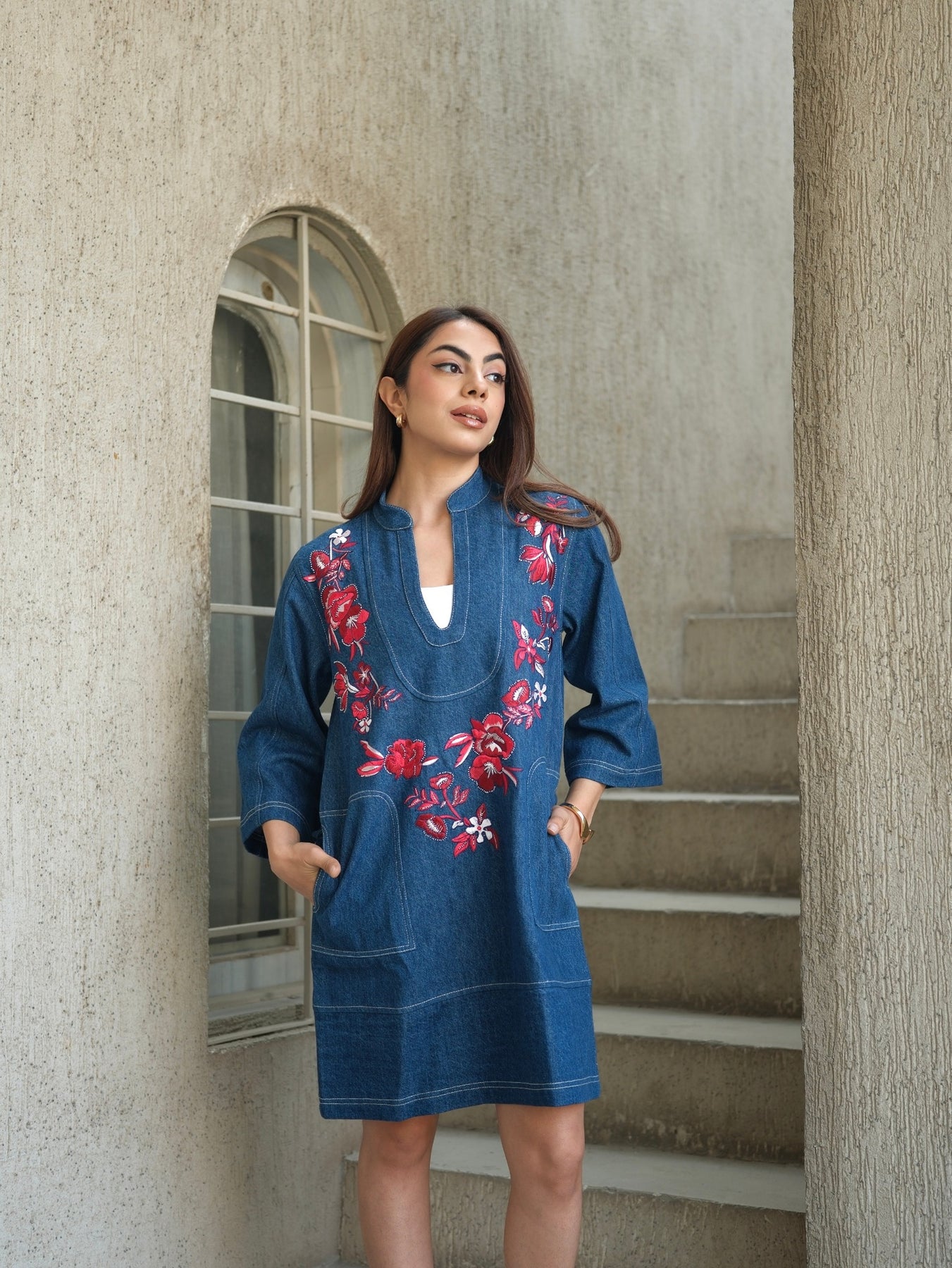 Miri's tunic-style denim dress features a modern Mandarin collar and a flattering neckline. The relaxed-fit silhouette is beautifully adorned with intricate floral embroidery in rich rose hues of silk threads, highlighted by hand beadwork that adds a touch of femininity. Functional oversized front pockets and contrast stitching add to the casual charm, making it perfect for luncheon outings with your girlfriends or on a special date.