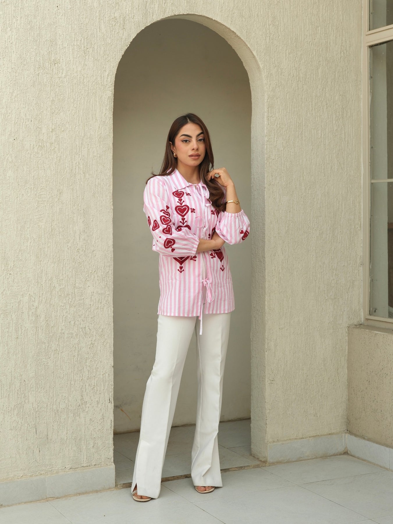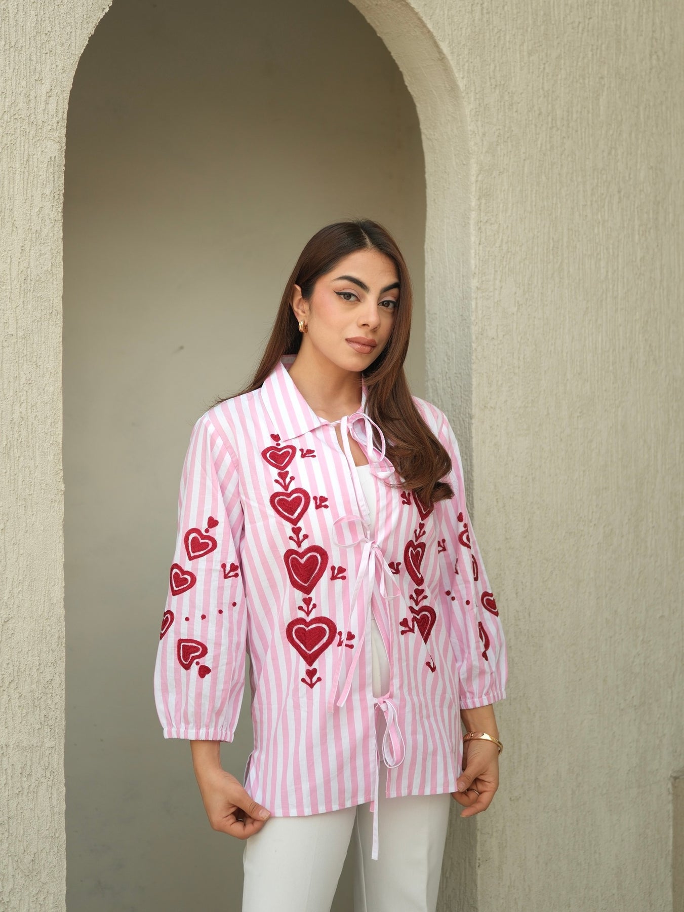 This open shirt crafted in a pink and white striped cotton is brought to life with beautiful Suzani embroidery inspired by the motif of love!